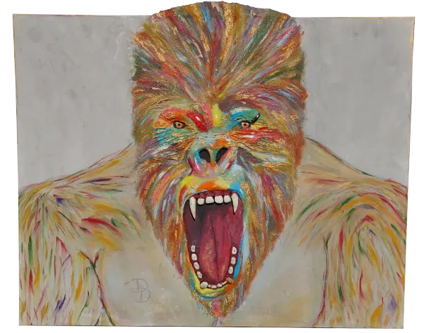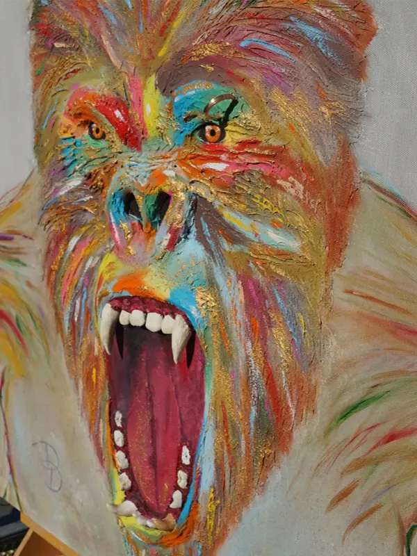 Ein verzweifelter Schrei nach Achtung seiner Art. Die Seltenheit eines Gorillas, ist heutzutage so ausgefallen, wie der Diamant in seinem Zahn. Dennoch, entgegen seiner Angst und Traurigkeit, trotzt er uns und glänzt mit seinen Farben. Eine Frage von Selbstschutz?!