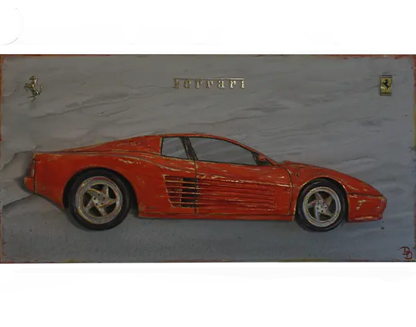 Acryl, Modellier- Schnitz- Spachteltechnik, Oil, Plattgold, Schriftzug Orignal von Ferrari, orignales Emblem und Originales Motorhauben Schild von Testarossa, weißer Diamant 0,4k
